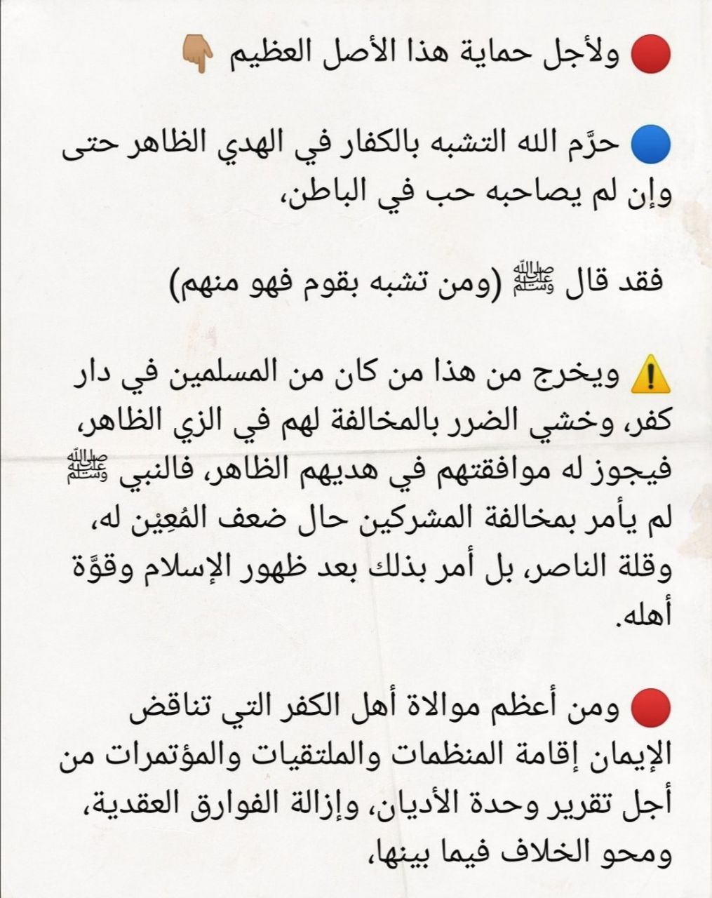 🔵 حرَّم الله التشبه بالكفار في الهدي الظاهر حتى وإن لم يصاحبه حب في الباطن،